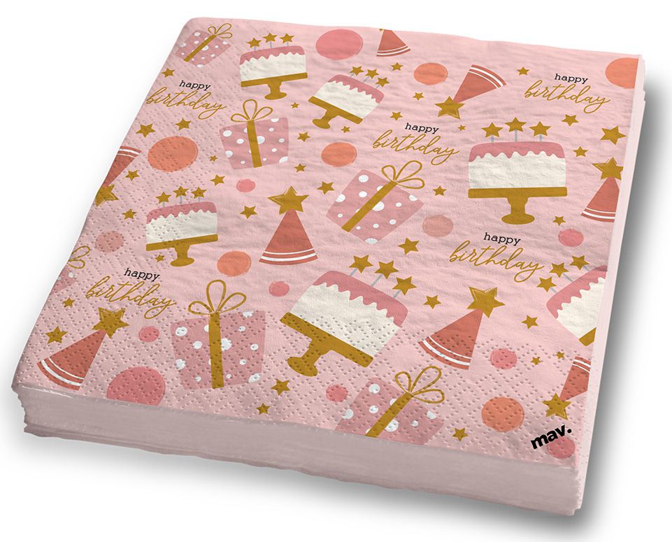 Schöne Servietten für eine Geburtstagsparty mit dem Aufdruck "Happy Birthday" und einem Torten-Motiv.